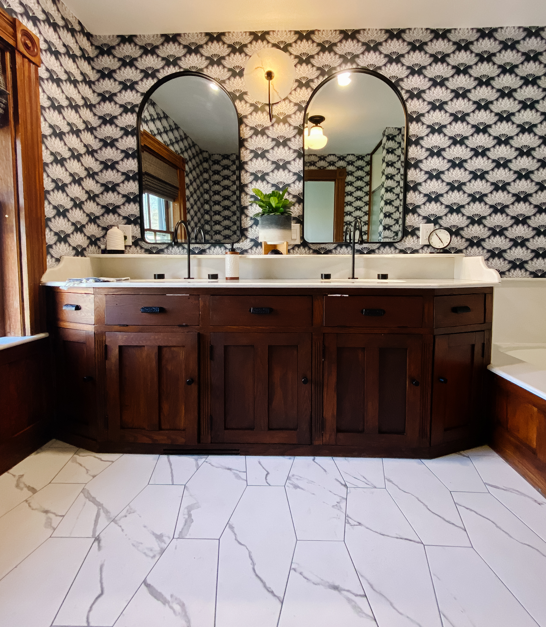 So, I selected a replacement in the form of a porcelain marble tile in an elongated hex pattern to update the space and bring a modern element in. I have a love of mixing old and new. This is an easy way to build character.